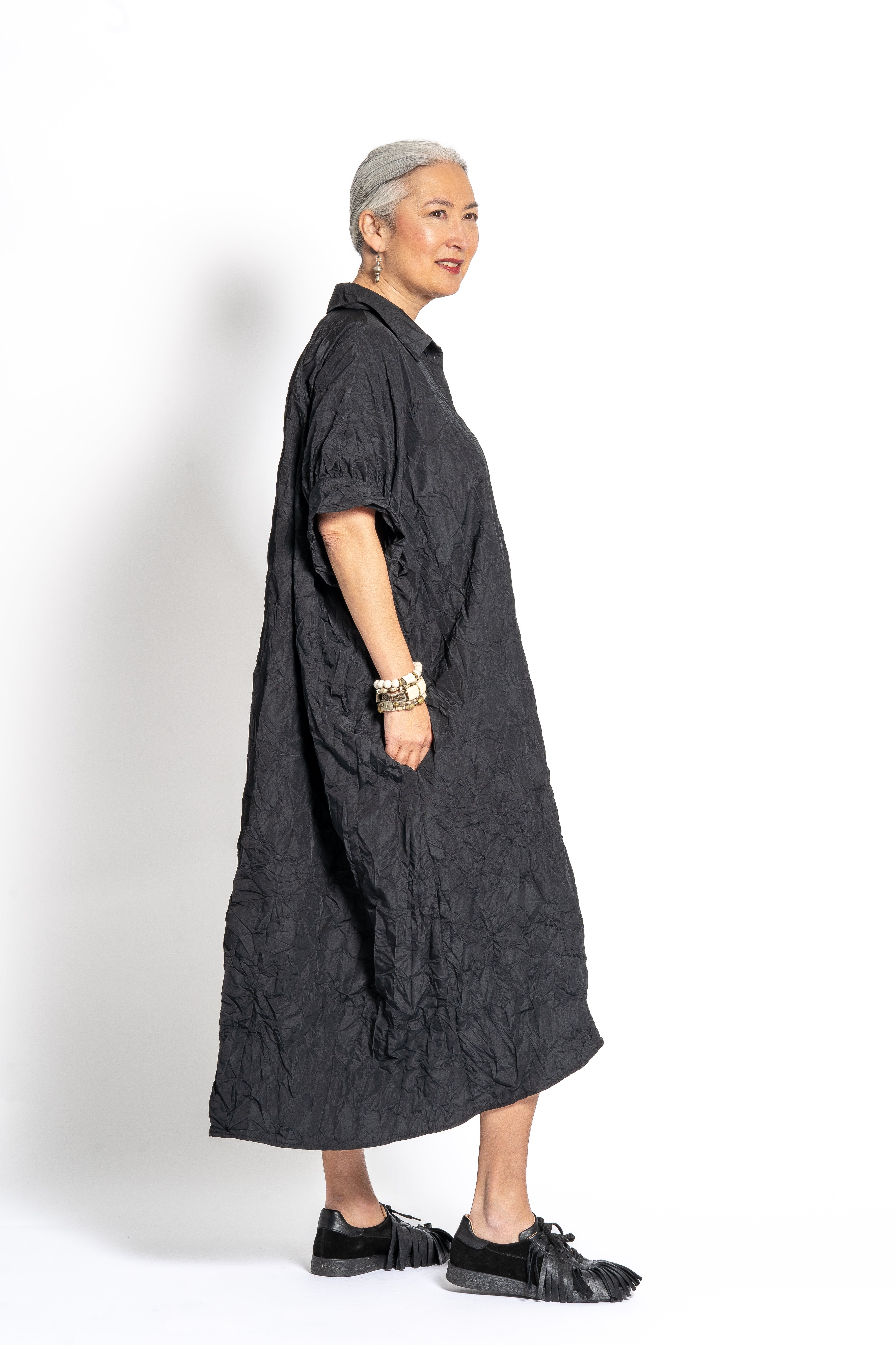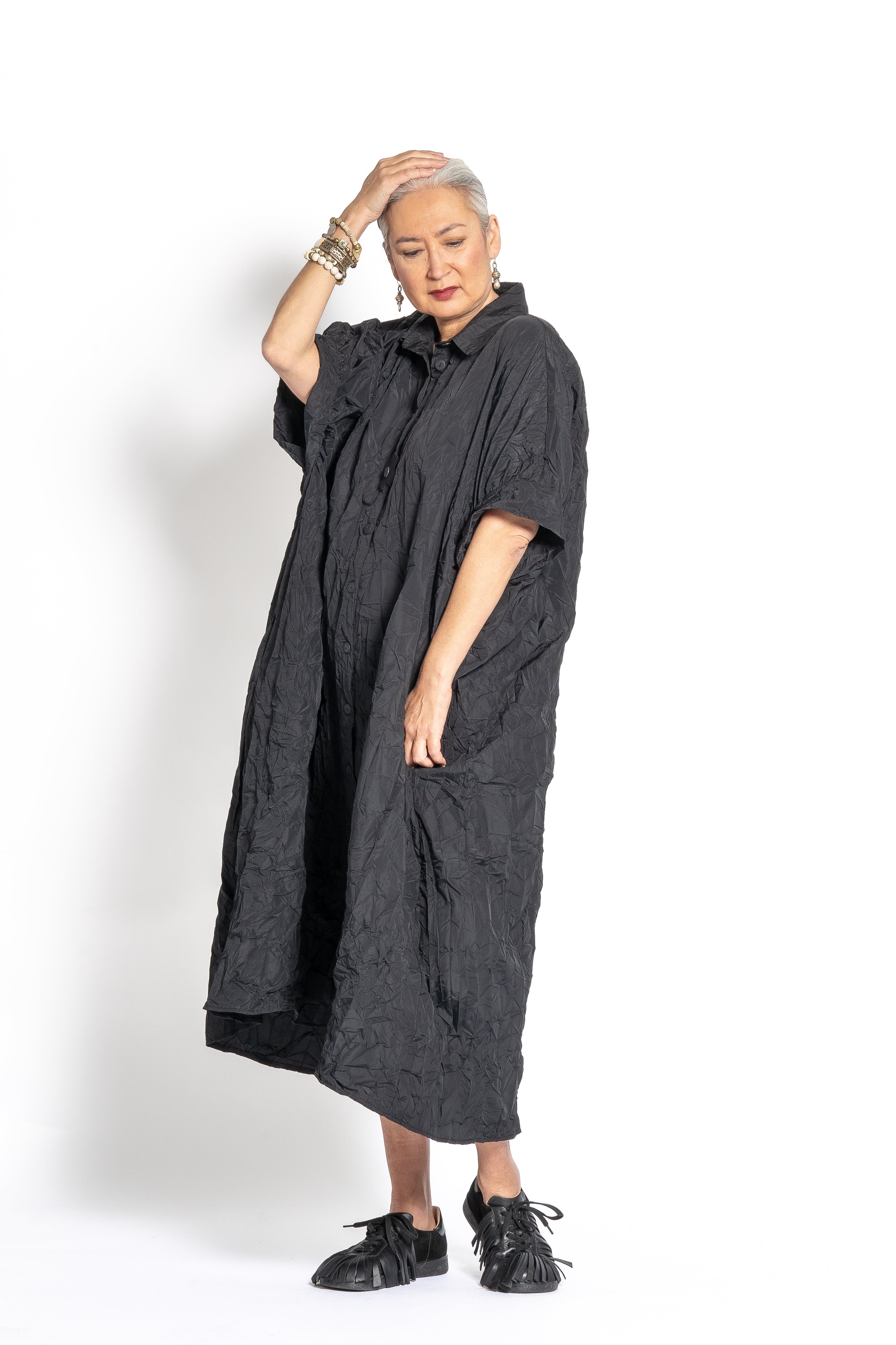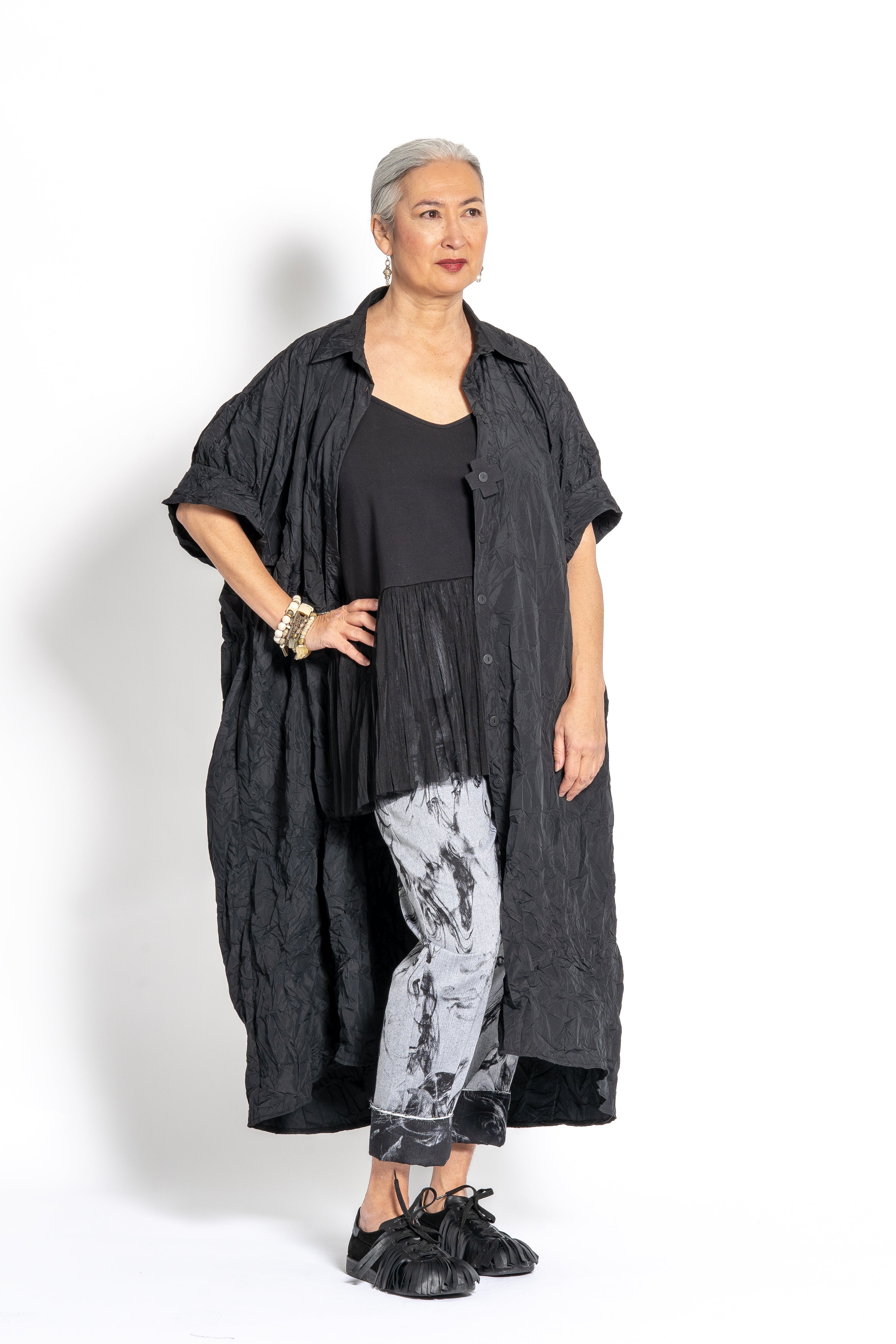 The PLUSLAVIE PLÜ Long Shirt, wear it as a solo dress, layered over pants, or styled open as an easy modern duster.