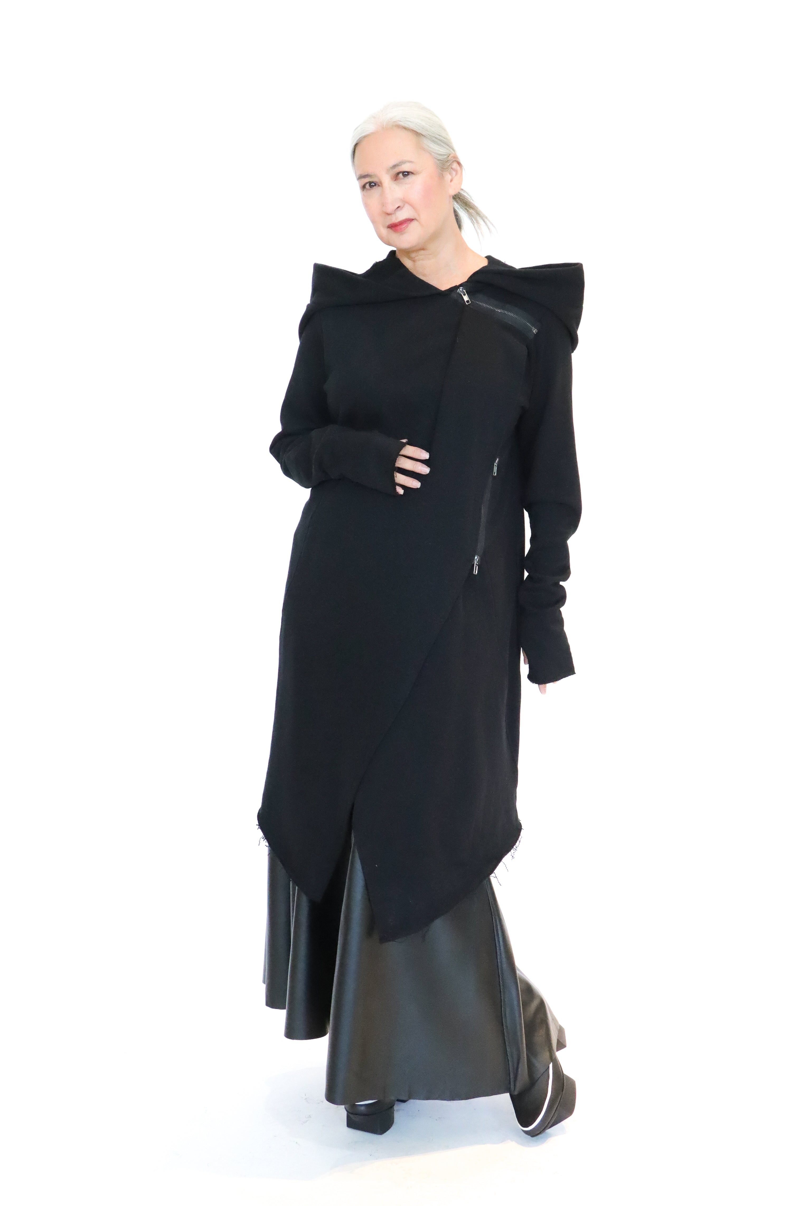 • Front shoulder and off-center short zippers